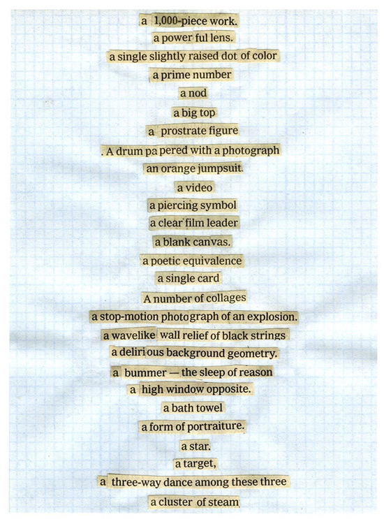 While reading the Art Reviews in the New York Times, I noticed that some descriptions mimicked scenarios of my artworks … "a burning house" possibly the projected film installation of my farmhouse ablaze…"a see-ya-later-wink- wink" as playing dice spilled into a solid plexi-glass cube… "a tsunami of memories" as collages made daily from found media scraps, dream texts, and poetics. Using a razorblade, I cut-out text-blocks then placed each down the centerline of quadrille grid pages. Composing by stacking emphasizes constructing with language. Rorschach-like silhouettes echo and expand the experience. As with all poetics, the act of translation occurs between the slippage of word and image.