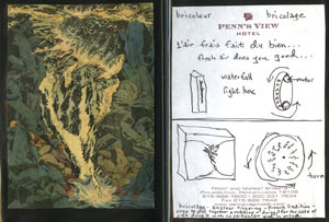 When traveling, I map daily walks. Tracing my steps combines hotel stationary, nightstand telephone book maps, local newspaper clippings, postcards, notations, ticket stubs, dream narrations and found scraps.