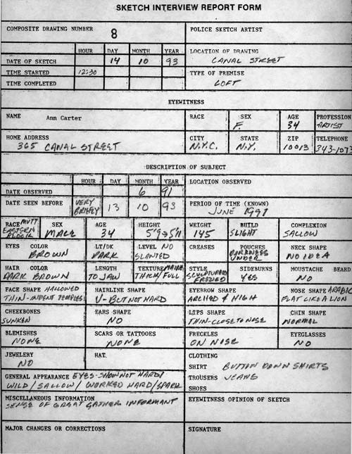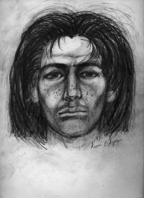 I began to schedule the meetings. Officer Sampson met the eyewitness, produced the sketch, left the sketch on site, and then telephoned upon leaving. I would immediately place a call to the eyewitness and fill out the questions listed on my Police Report Form. Afterward, I would arrange to collect the composite. A total of 17 sketches were completed over the two-year period. I asked Officer Sampson to draw the last from his memory of the others. Notes: Each drawing contains a key feature that the eyewitness recalled as unique. This vivid feature becomes their descriptive starting point. Such communicates from the overall facial structure to someone out in the world. It functions as the element that causes one to say, "I know that person." Because the sketches reflect the subject over a long period of time, we had a built-in variety of hair length. The most common practice used to avoid identification is to alter one’s hair (cutting, growing, dying, shaving, etc.). The sketch artist did not need to draw time-elapsed hair change transparencies.