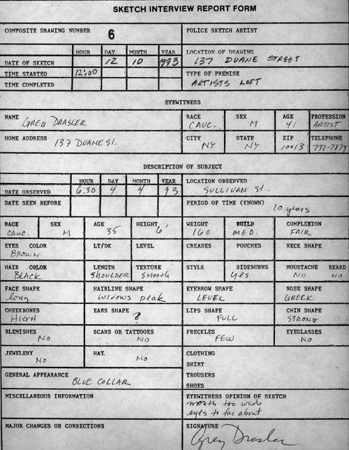 Officer Kevin Sampson was regarded as one of the best in the composite field. Over a 20-year career, his drawings (published in the local media or handed to detectives) had led to a very high percentage ratio of identification and apprehension. He had developed a distinct style that aided in the development of the character through the use of subtle shading and attention to the rendering of hair. His composite style was more appealing to me than the “cartoon-like” renderings of other police artists. Over the course of several telephone conversations, he enthusiastically provided information and insights into the system.