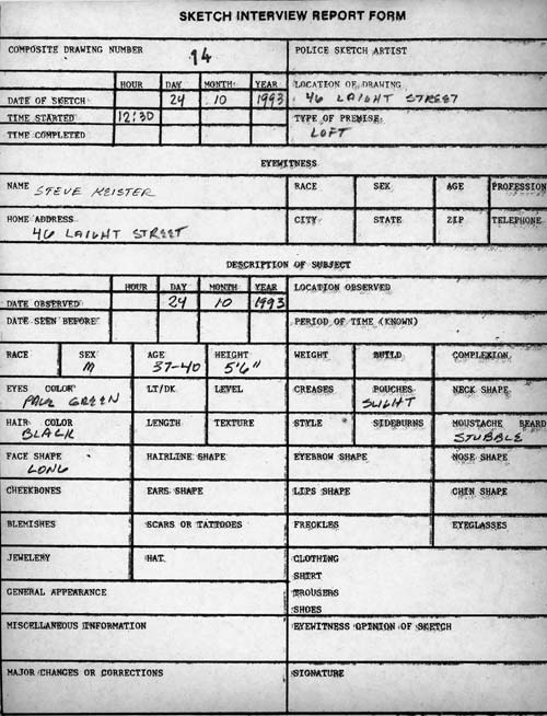 I began to schedule the meetings. Officer Sampson met the eyewitness, produced the sketch, left the sketch on site, and then telephoned upon leaving. I would immediately place a call to the eyewitness and fill out the questions listed on my Police Report Form. Afterward, I would arrange to collect the composite.