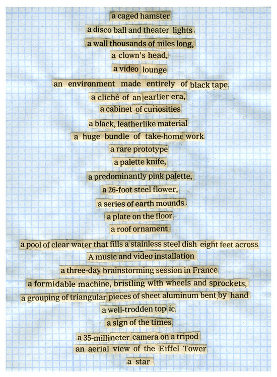 While reading the Art Reviews in the New York Times, I noticed that some descriptions mimicked scenarios of my artworks … "a burning house" possibly the projected film installation of my farmhouse ablaze…"a see-ya-later-wink- wink" as playing dice spilled into a solid plexi-glass cube… "a tsunami of memories" as collages made daily from found media scraps, dream texts, and poetics. Using a razorblade, I cut-out text-blocks then placed each down the centerline of quadrille grid pages. Composing by stacking emphasizes constructing with language. Rorschach-like silhouettes echo and expand the experience. As with all poetics, the act of translation occurs between the slippage of word and image.
